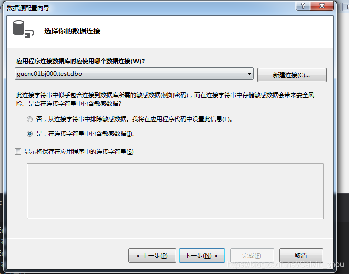 选择“数据集”选项, 由于连接字符串存储一些敏感信息,在界面中提供了两个供用户选择的单选按钮,这里选择“是,在连接字符串中包含敏感数据”单选按钮,单击“下一步”按钮