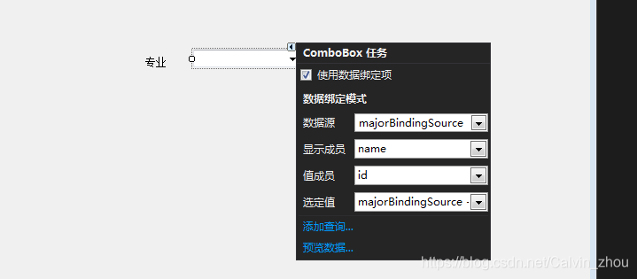• 使用数据绑定的方式绑定组合框控件直接单击组合框的 "数据绑定快捷键" 图标,弹出“ComboBox任务”菜单,如下图所示